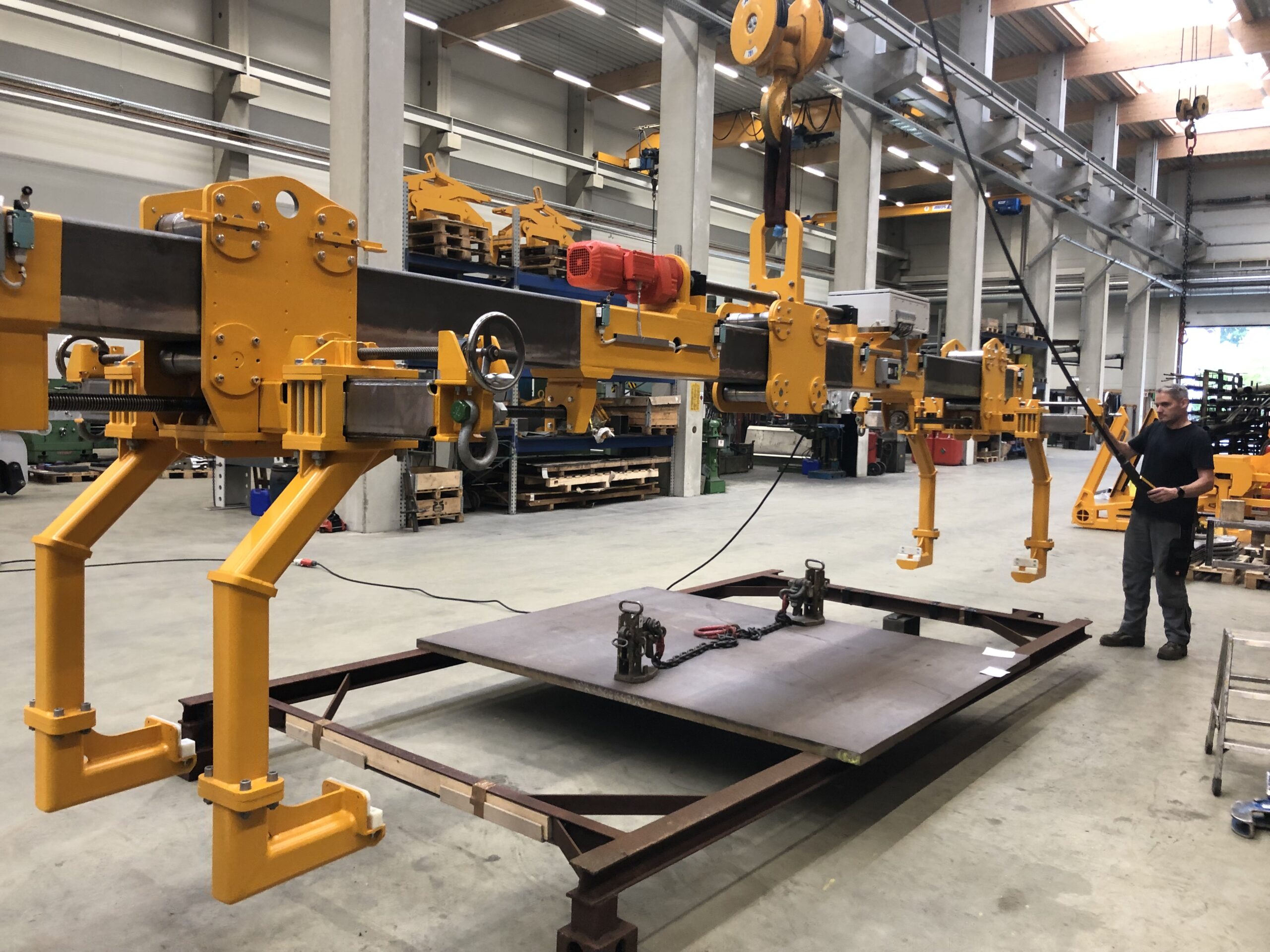 - Schwerpunktausgleich durch mit elektromotorisch angetriebenen Rollenketten- oder Spindeltrieben verstellbare Aufhänger oder Kranhakenaufnahmen