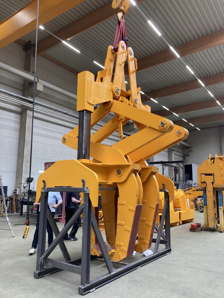 - Öffnen und Schließen der Greifarme mechanisch, mit elektromotorisch angetriebenen Rollenketten- oder Spindeltrieben oder mit Hydraulikzylindern